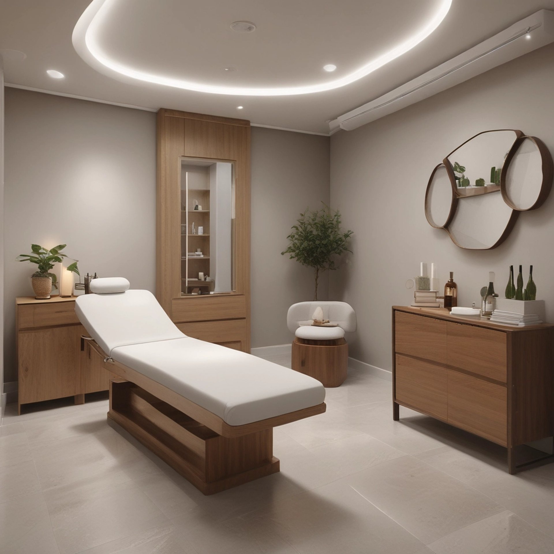 A serene medspa treatment room bathed in soft natural light, with elegant skincare products neatly arranged.